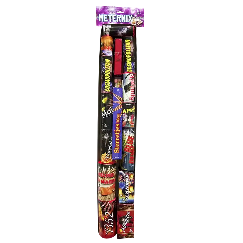 Traditioneel meterpakket met van alles wat voor heel de familie! Verschillende fonteinen, sterretjes en ander siervuurwerk.Specificaties